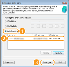 ![]() ![]() Makina detektatzen ez bada Sakatu [Refresh]. Arazoak jarraitzen badu, sakatu [IP helbidea] edo [MAC helbidea], sartu makinaren IP helbidea edo MAC helbidea (Sare ezarpenak begiratzea) eta sakatu [Hurrengoa].