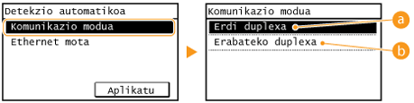 ukitu <Erdi duplexa> edo <Erabateko duplexa>.![]() <Erdi duplexa>Komunikazio-datuak txandaka bidali eta jasotzen ditu. Hautatu makina sare-gailu batera duplex erdia erabiliz konektatuta dagoenean.