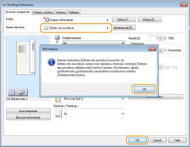 Sakatu [Inprimatze-ezarpenak] bereizlea kopia kopurua edo Alde batetik/Bi aldeetatik inprimatzea bezalako inprimatze-ezarpenak adierazteko balio duen pantaila bat bistaratzeko. Hemen adierazitako ezarpenak inprimatze-lan osoari aplikatuko zaizkio.