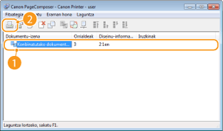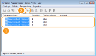 Canon PageComposer erabiliz, hainbat dokumentu inprimatze-lan bakar batean konbina dezakezu eta lana zehaztutako inprimatze-ezarpenekin inprimatu. Funtzio honek, adibidez, aplikazio ezberdinak erabiliz sortutako dokumentuak konbinatzeko aukera ematen du, eta baita orrialde guztiak paper-tamaina berean inprimatzekoa ere.