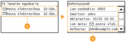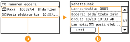 ![]() <TX lanaren egoera>Bidalitako edo prozesatzeko zain dauden dokumentuen zerrenda bat bistaratzen du.