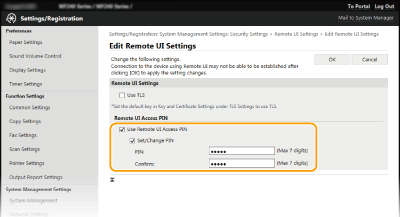 Hautatu [Use Remote UI Access PIN] kontrol-laukia eta ezarri PINa.