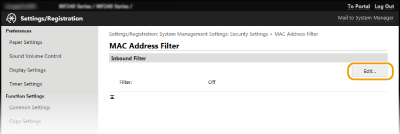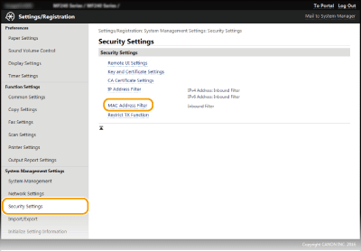 ![]() Egiaztatu sarreran akatsik dagoen MAC helbidezuzenak behar bezala ez badira sartzen, baliteke ezinezkoa izatea makinan sartzea Remote UI (Urruneko EIa) erabiliz; hori gertatuz gero, ezarri <MAC helbidearen iragazkia> hona: <Desaktibatuta>. MAC helbidearen iragazkia