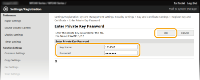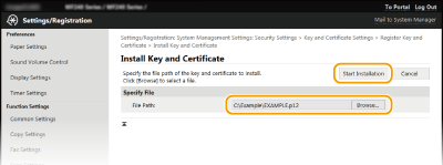 Sakatu [Key and Certificate Settings] kode-pare bat instalatzeko, edo [CA Certificate Settings] CA ziurtagiri bat instalatzeko.