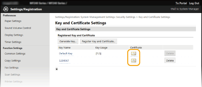 Sakatu [Key and Certificate Settings] kode-pare bat egiaztatzeko, edo [CA Certificate Settings] CA ziurtagiri bat egiaztatzeko.