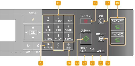 通信中、印刷中など、何らかの動作を行っているときに点滅します。処理待ちの文書があるときには点灯します。