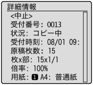 選んだ項目に応じて、現在の状況を表示します。以下の画面は、<コピージョブ状況>の表示例です。