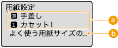 (用紙設定)を押すと、<用紙設定>画面が表示されます。印刷したい用紙を選んでください。また、たとえば給紙カセットに今までと異なるサイズの用紙をセットしたときは、その用紙サイズも同時に設定しなければなりませんが、このときも