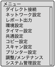 を押すと、<メニュー>画面が表示されます。<環境設定>や<タイマー設定>などの全般的な設定から、コピーやスキャンなど各機能に関する設定まで、本機で行う設定の多くはこのキーを押してから始めます。