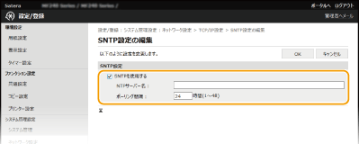 ![]() | SNTPはネットワーク上のタイムサーバーを基準にして時刻を調整するためのプロトコルです。本機とサーバー間で時刻を同期させる必要がある場合に使用します。協定世界時(UTC)を基準に動作するので、時差(タイムゾーン)をあらかじめ設定しておいてください(日付/時刻の設定)。SNTPの設定はリモートUIを使って行います。 |