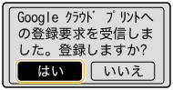 モバイル機器やGoogle Chromeから登録するモバイル機器やGoogle Chromeから本機を登録することもできます*。登録完了前に本機のディスプレーに以下の確認画面が表示されますので、<はい>を押して登録を完了してください。 * 登録方法については、お使いの機器の取扱説明書やGoogle Cloud Printのホームページを参照してください。 |