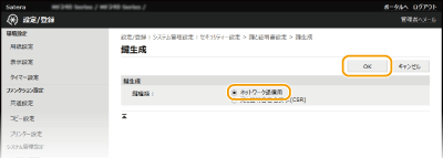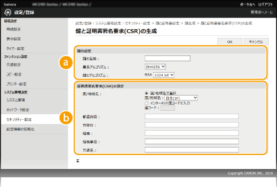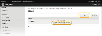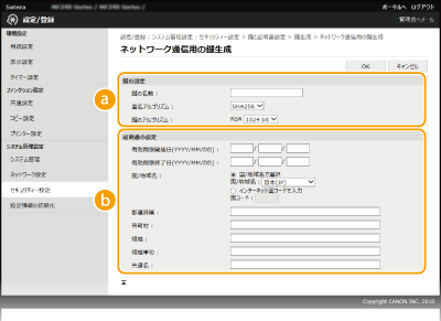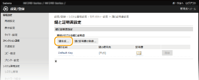 Transport Layer Security(TLS)を使った暗号化通信に必要な鍵ペアを生成できます。TLSは、リモートUIを使って本機にアクセスするときに使用できます。本機に登録できる鍵ペアはプリインストールされている鍵ペアと合わせて最大5つです。「ネットワーク通信用」に生成した鍵ペアでは自己署名証明書が使われます。「鍵と証明書署名要求(CSR)」では、本機で生成した鍵ペアに対して認証局発行の電子証明書を申請することができます。