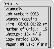 Displays the current status of the selected item. The <Copy Job Status> screen is shown below as an example.