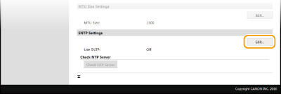 ![]() | Simple Network Time Protocol (SNTP) enables you to adjust the system clock by using the time server on the network. The protocol is typically used for synchronizing the machine and a server. The time is adjusted based on Coordinated Universal Time (UTC), so specify the time zone setting before configuring SNTP (Date/Time Settings). SNTP settings can be specified via the Remote UI. |