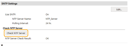 Testing communication with the NTP/SNTP serverYou can view communication status with the registered server by clicking [Settings/Registration] [Network Settings] [TCP/IP Settings] and then clicking [Check NTP Server] in [SNTP Settings] that appears. If a proper connection has been established, the result is displayed as shown below. Note that this operation does not adjust the system clock.![]() |