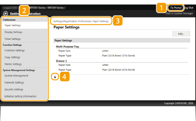 Displays [Settings/Registration] page. When you have logged on in System Manager Mode, you can change the settings items and save/load the registered data.