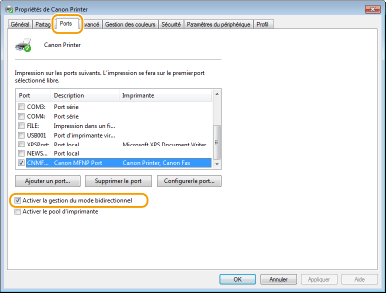 Si vous utilisez une connexion réseau et que vous ayez modifié l'adresse IP de l'appareilSi [Description] pour le port sélectionné est [Canon MFNP Port] et que l'appareil et l'ordinateur appartiennent au même sous-réseau, la connexion est maintenue. Vous n'avez pas besoin d'ajouter un nouveau port. En revanche, si la description indique [Standard TCP/IP Port], alors vous devez ajouter un nouveau port. Configuration des ports d'imprimante |