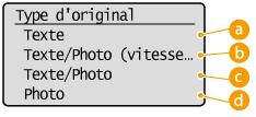 ![]() | Vous pouvez sélectionner la qualité d'image optimale de la copie selon le type de document (document texte, documents comportant des diagrammes ou des graphiques ou photos de magazine, par exemple). |
