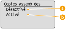 | | Lorsque vous envisagez de réaliser plusieurs copies d'un document de plusieurs pages, réglez <Copies assemblées> sur <Activé> pour trier les copies dans l'ordre des pages. Ce mode est très utile pour préparer des documents à distribuer pour les réunions ou présentations. |