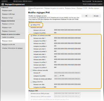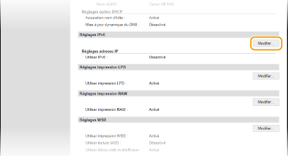 Vérifier si les réglages sont correctsAssurez-vous que l'écran de l'IU distante s'affiche sur votre ordinateur avant d'utiliser l'adresse IPv6 de l'appareil. Démarrage de l'interface utilisateur distante Utilisation du panneau de commandeL'écran <Menu> permet aussi d'accéder aux réglages IPv6. Réglages IPv6 |