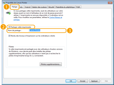 Pour procéder à l'opération suivante, connectez-vous à l'ordinateur à partir d'un compte d'administrateur. Il peut être impossible d'installer les pilotes par le réseau selon le système d'exploitation et l'architecture (32 bits ou 64 bits) du serveur d'impression et des ordinateurs clients. Lorsque vous mettez en œuvre un serveur d'impression dans l'environnement d'un domaine, consultez votre administrateur réseau. |
