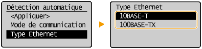 3 | Sélectionnez le type Ethernet. Sélectionnez <Type Ethernet> sélectionnez <10BASE-T> ou <100BASE-TX> .![]() |