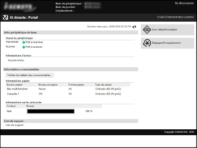 [Mode utilisateur général]Vous pouvez vérifier l'état des documents ou de l'appareil et modifier certains réglages. Si vous désirez supprimer les documents imprimés, renseignez le nom de l'utilisateur associé aux documents dans [Nom d'utilisateur ]. Le nom d'utilisateur est automatiquement défini pour les documents imprimés selon les informations telles que le nom de l'ordinateur ou le nom de connexion à l'ordinateur.
