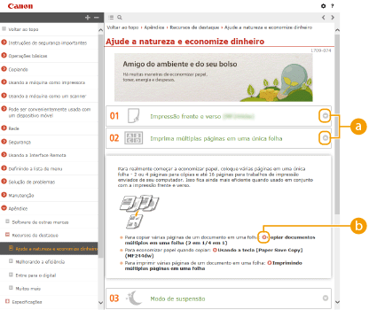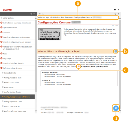 Clique para especificar as configurações como tamanho de texto, layout e método de exibição do Guia do usuário.