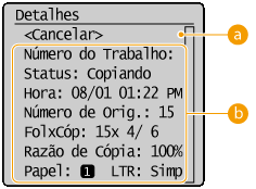 O número de cópias, configurações e outros detalhes são exibidos. Se você deseja somente verificar os detalhes sem cancelar a cópia, pressione
