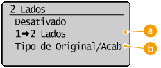 <2 Lados> pode não estar disponível para alguns tipos e tamanhos de papel. <2 Lados> não está disponível quando usar <Paper Save Copy> ou <Cópia do Cartão ID>. |