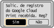 Registrando de um dispositivo móvel ou Google ChromeVocê pode também registrar a máquina de um dispositivo móvel ou do Google Chrome*. O visor da máquina mostrará a tela de confirmação a seguir antes da conclusão do registro. Selecione <Sim> para concluir o registro. * Para saber mais sobre o procedimento de registro, consulte o manual de instruções de seu dispositivo móvel ou o site do Google Cloud Print. |