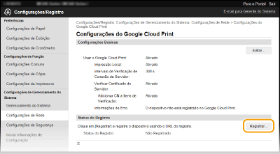 Você precisa ativar o Google Cloud Print. Clique em [Editar], selecione a caixa de seleção [Usar o Google Cloud Print] e clique em [OK].