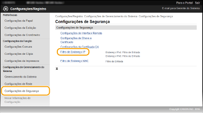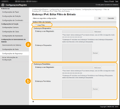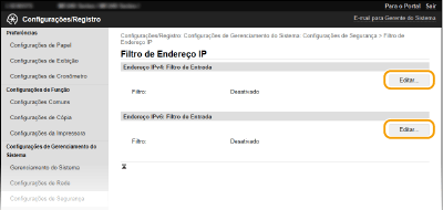 Verifique se há erros de entradaSe os endereços IP forem digitados incorretamente, provavelmente, você não poderá acessar a máquina a partir da Interface Remota. Neste caso, você precisará definir o <Filtro de Endereço IPv4> ou o <Filtro de Endereço IPv6> como <Desativado>. Filtro de Endereço IPv4 Filtro de Endereço IPv6  Forma de entrada de endereços IP | Descrição | Exemplo | Digitando um único endereço | IPv4: Delimite os número com pontos. | 192.168.0.10 | IPv6: Delimite os caracteres alfanuméricos com vírgulas. | fe80::10 | Especificando um intervalo de endereços | Insira um hífen entre os endereços. | IPv4: 192.168.0.10-192.168.0.20 | IPv6: fe80::10-fe80::20 | Especificando um intervalo de endereços com um prefixo (somente IPv6) | Digite o endereço, seguido de uma barra e um número indicado o comprimento do prefixo. | fe80::1234/64 |