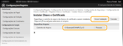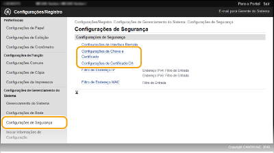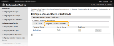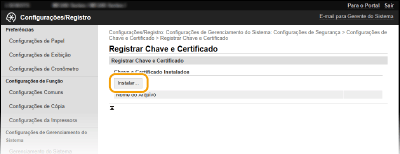 Clique em [Configurações de Chave e Certificado] para instalar um par de chaves ou em [Configurações de Certificado CA] para instalar um certificado de CA.