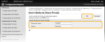 2 | Insira o nome do par de chaves e senha e, em seguida, clique em [OK]. [Nome da Chave] Digite até 24 caracteres alfanuméricos para o nome do par de chaves a ser registrado. [Senha] Digite até 24 caracteres alfanuméricos para a senha do conjunto de chave privada para o arquivo a ser registrado. |