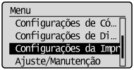 ![]() | Todas as configurações sobre a impressora são listadas com pequenas descrições. As configurações padrão são marcadas com uma cruz ( ). |