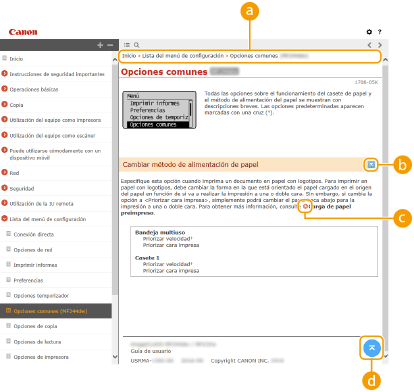 Haga clic para especificar opciones como el tamaño de texto, el formato y el método de visualización de la Guía de usuario.