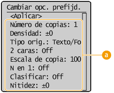 . Si cambia esta configuración predeterminada para adaptarla a las operaciones que realiza con mayor frecuencia, puede eliminar la necesidad de realizar la misma configuración cada vez que realice copias.