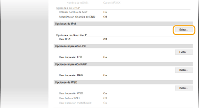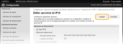 Comprobación de las opciones correctasAsegúrese de que la pantalla de la IU remota pueda mostrarse en el ordenador utilizando la dirección IPv6 del equipo. Inicio de la IU remota Uso del panel de controlTambién es posible acceder a las opciones de IPv6 desde la pantalla <Menú>. Opciones de IPv6 |