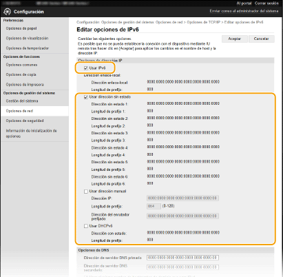 Dirección manual | 1 | Dirección que se introduce manualmente. Cuando utilice esta dirección, especifique la longitud del prefijo y la dirección del router predeterminada. |