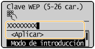 5 | Introduzca la clave de red que tenga anotada. Introduzca la clave de red utilizando las teclas numéricas, seleccione <Aplicar> y pulse . Introducción de texto![]() |