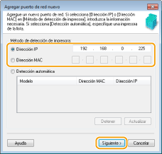 Si la dirección IP del equipo se ha modificado, añada un nuevo puerto. La adición de puertos es también una solución eficaz cuando se selecciona un tipo de puerto incorrecto en la carpeta de la impresora de Windows durante la instalación del controlador de impresora.