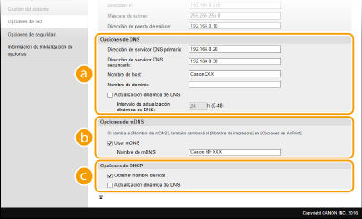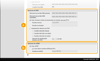 2 | Configure las opciones de DNS IPv4. ![]() [Opciones de DNS][Dirección de servidor DNS primario] Introduzca la dirección IP de un servidor DNS. [Dirección de servidor DNS secundario] Introduzca la dirección IP de un servidor DNS secundario, si existe. [Nombre de host] Introduzca hasta 47 caracteres alfanuméricos en el nombre de host del equipo que vaya a registrar en el servidor DNS. [Nombre de dominio] Introduzca hasta 47 caracteres alfanuméricos en el nombre del dominio al que pertenezca el equipo, como "example.com". [Actualización dinámica de DNS] Seleccione la casilla de verificación para actualizar dinámicamente los registros DNS cuando cambie la dirección IP del equipo. Cuando especifique el intervalo entre las actualizaciones, introduzca el tiempo en horas en el cuadro de texto [Intervalo de actualización dinámica de DNS]. [Opciones de mDNS][Usar mDNS] Adoptado por Bonjour, mDNS (DNS multidifusión) es un protocolo para relacionar un nombre de host con una dirección IP sin utilizar DNS. Seleccione la casilla de verificación para activar mDNS e introduzca el nombre de mDNS en el cuadro de texto [Nombre de mDNS]. [Opciones de DHCP][Obtener nombre de host] Seleccione la casilla de verificación para habilitar la Opción 12 y obtener el nombre de host del servidor DHCP. [Actualización dinámica de DNS] Seleccione la casilla de verificación para habilitar la Opción 81 y actualizar dinámicamente los registros DNS a través del servidor DHCP. |