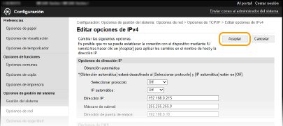 Uso del panel de controlTambién es posible acceder a las opciones de DNS desde la pantalla <Menú>. Opciones de IPv4 Opciones de IPv6 |