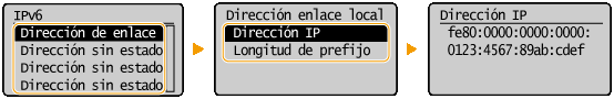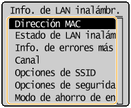<Estado de LAN inalámbrica> y <Info. de errores más recientes> pueden visualizarse desde . Pulse <Información de red> <Método de conexión de red> y seleccione la opción que desee visualizar. |