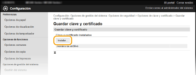 Haga clic en [Opciones de clave y certificado] para instalar un par de claves o en [Opciones de certificado de CA] para instalar un certificado de CA.