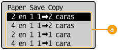Puede utilizar <2 en 1>/<4 en 1> para copiar varios documentos en una única hoja, y <2 caras> para copiar el documento en ambas caras de una página. El uso de