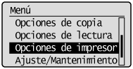 Todas las opciones sobre la impresora se muestran con descripciones breves. Las opciones predeterminadas aparecen marcadas con una cruz (