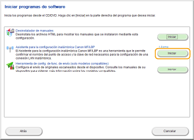Haga clic en [Iniciar] para [Asistente para la configuración inalámbrica Canon MF/LBP].