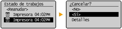 Cancelación desde la IU remotaPodrá cancelar la impresión desde la página [Estado de trabajos] de la IU remota: Comprobación del estado actual de los documentos de impresión